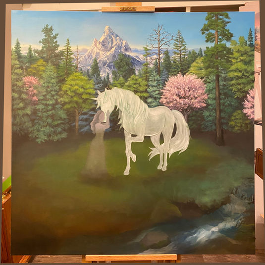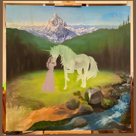 The client as her younger self in a forest with a unicorn next to her, as partners, equals. Her auburn hair is down, her dress akin to what the Lady Guinevere would wear with the addition of light